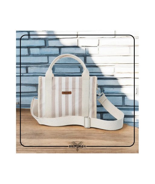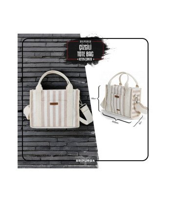 • Krem Çizgili Keten Tote Bag Çanta